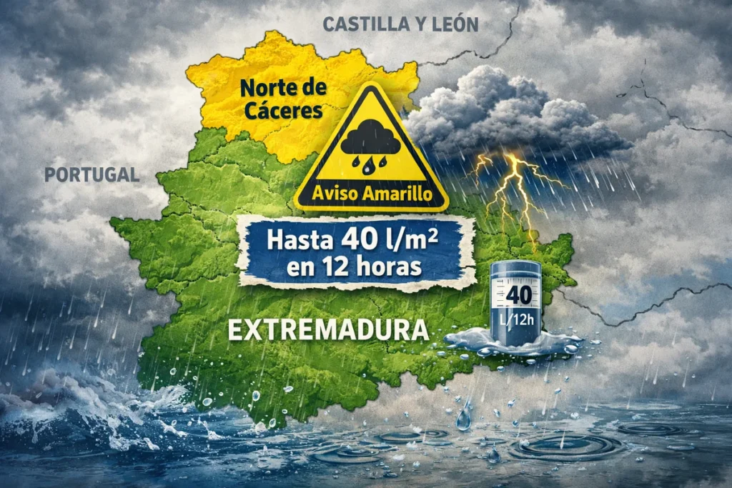El norte de la provincia de Cáceres afrontará este lunes una situación meteorológica adversa, con la activación del aviso amarillo por lluvias intensas. Según las previsiones oficiales, podrían acumularse hasta 40 litros por metro cuadrado en apenas 12 horas, una cantidad significativa que incrementa el riesgo de incidencias.